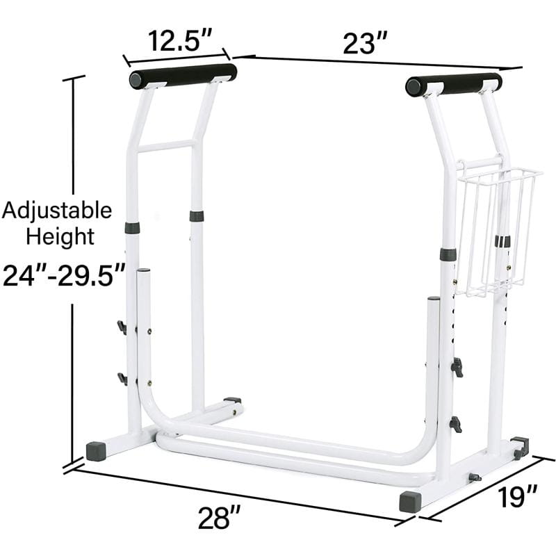 - FOR YOUR SAFETY – Includes Anti-slip rubber tip to prevent toilet frame from sliding. To avoid forward tipping of toilet frame, always place hands centered on grab bars and push downwards (not forward) and ensure even weight distribution. Product Dimensions: 19” x 28” x 24-29.5”