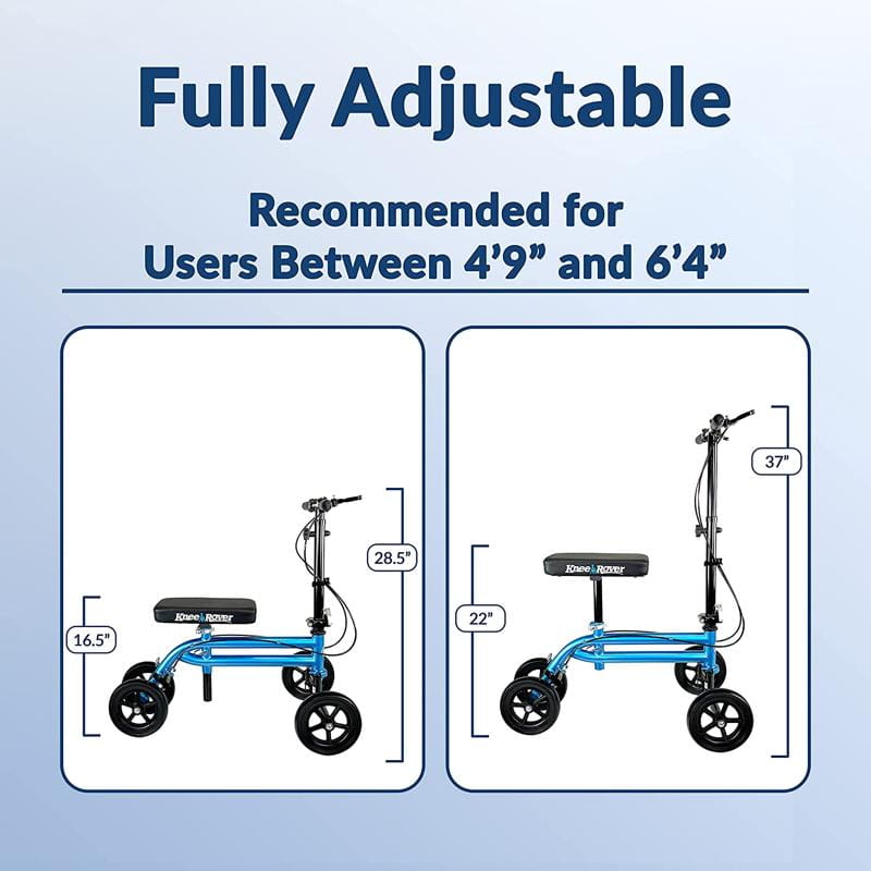 - FULLY ADJUSTABLE AND COMPACT: The Economy Steerable Knee Scooter also features handlebars with a quick release folding mechanism for easy transport and storage. Kneewalker has handlebars and padded knee platform that easily adjust for a comfortable fit.
