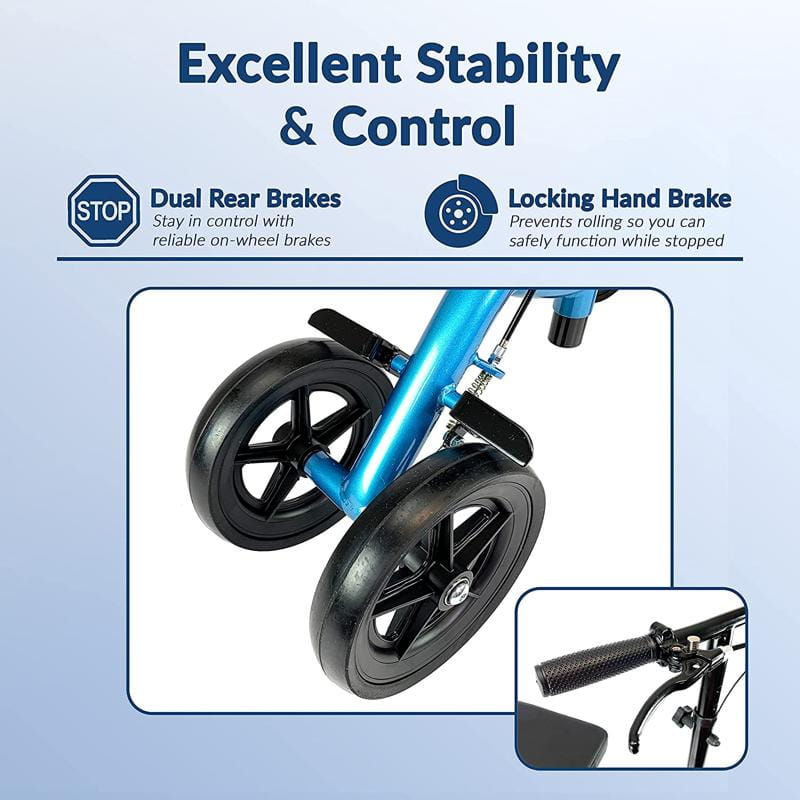 - STABILITY AND CONTROL: These easy to maneuver steerable knee scooter walkers feature four 7.5″ rubber wheels, Dual adjustable locking handbrakes and dual rear on-wheel brakes.
